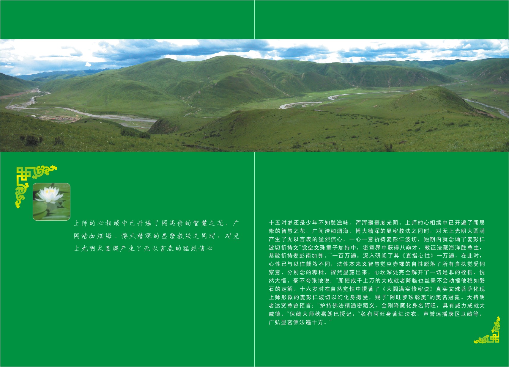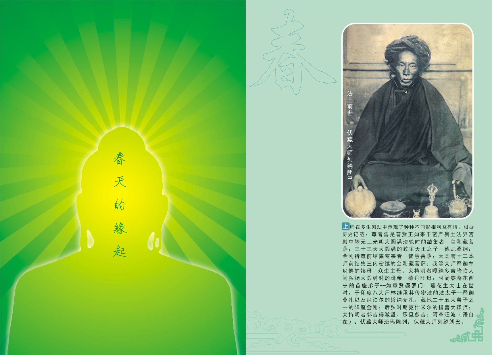 大持明者嘎绕多吉降临人间弘扬大圆满时的母亲——德丹旺母;阿阇黎蒋花西宁的首座弟子——如意贤婆罗门;莲花生大士在世时,于印度八大尸林继承其传密法的法太子——释迦莫扎以及尼泊尔的哲纳麦扎,藏地二十五大弟子之一的降魔金刚;后弘时期克什米尔的措普大译师;大持明者郭吉得澈坚、乐旦多吉;阿革旺波(语自在);伏藏大师班玛陈列,伏藏大师列绕朗巴。