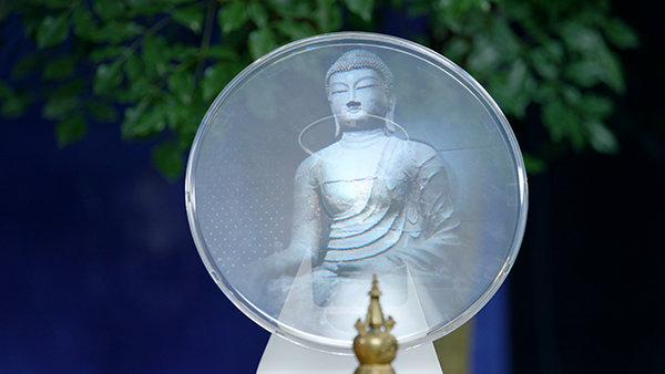 这里讲的是佛教的观点,同时也是科学的结论。我们看到的一切物质都以这种模式存在,只不过人类的视觉太迟钝,觉察不到。比如说,如果用照相机拍摄这个正在转动的道具,把快门速度调成最高,那么结果只能拍出200多个点,再稍慢一点就拍出残缺的图像。因为在高速快门抓拍下,光点的运动痕迹不会形成完整的环形旋火轮,所以也就无法拍到完整的佛像。如果把快门调得非常慢的话,可能也拍不出佛像。只有将它设置到与人眼差不多的灵敏度,才能拍出完整的佛像。