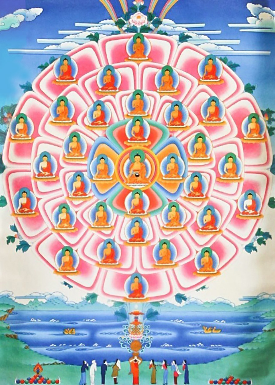 然后,我们简单地观想:自己的周围变得如极乐世界一般清净,在自己的面前有一朵很大的花,这朵花有三十四个花瓣,每一个花瓣上面安坐着一尊佛,中间的花心上是释迦牟尼佛,其他三十四尊佛在他的前后左右环绕。