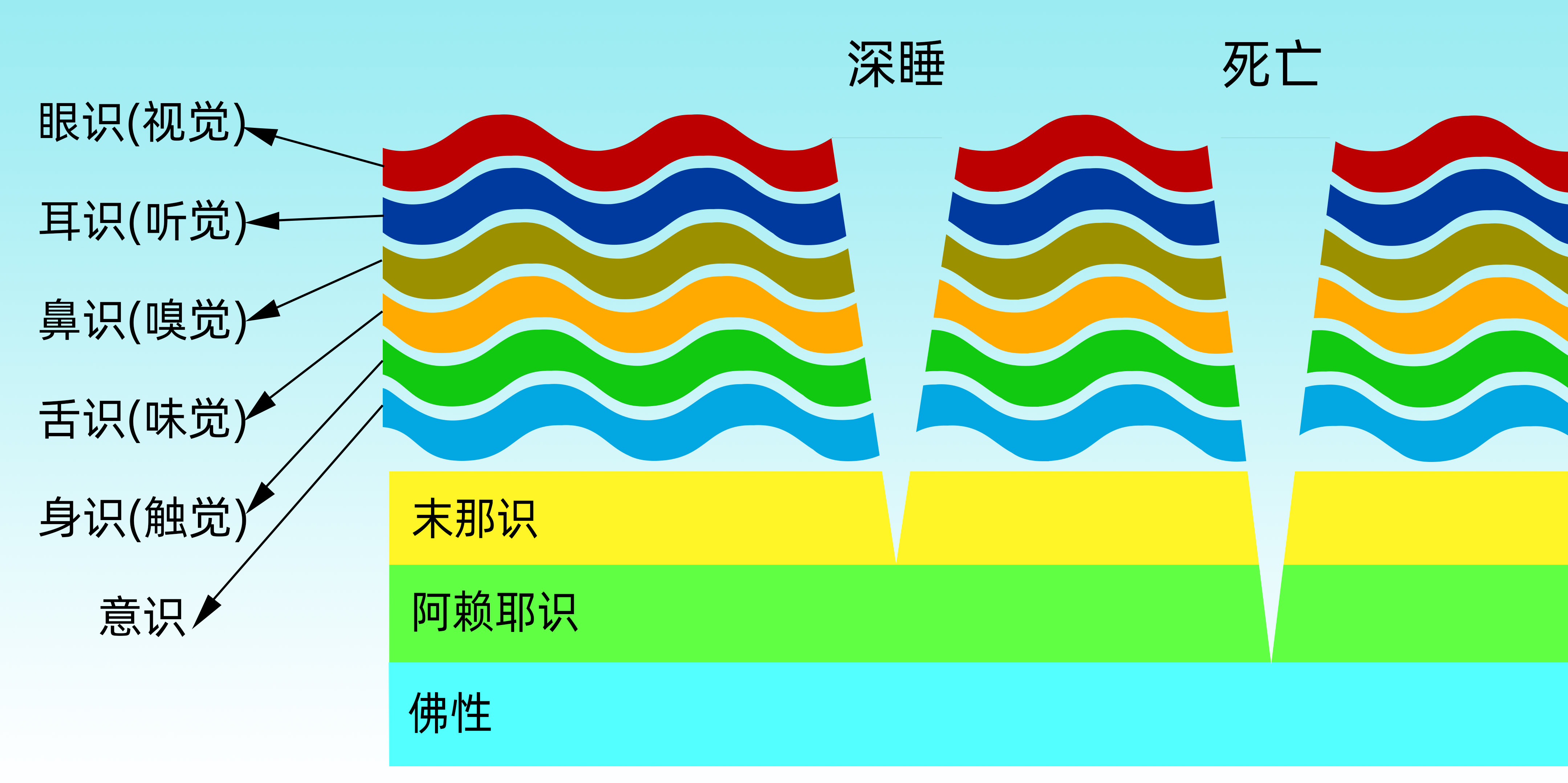 死亡的时候,前面的六识和末那识都不复存在,连阿赖耶识也受到了破坏,出现了很小的一块间隙。也就是说,阿赖耶识在瞬间断掉了,但很快就会恢复如初。此时唯一存在就是佛性。