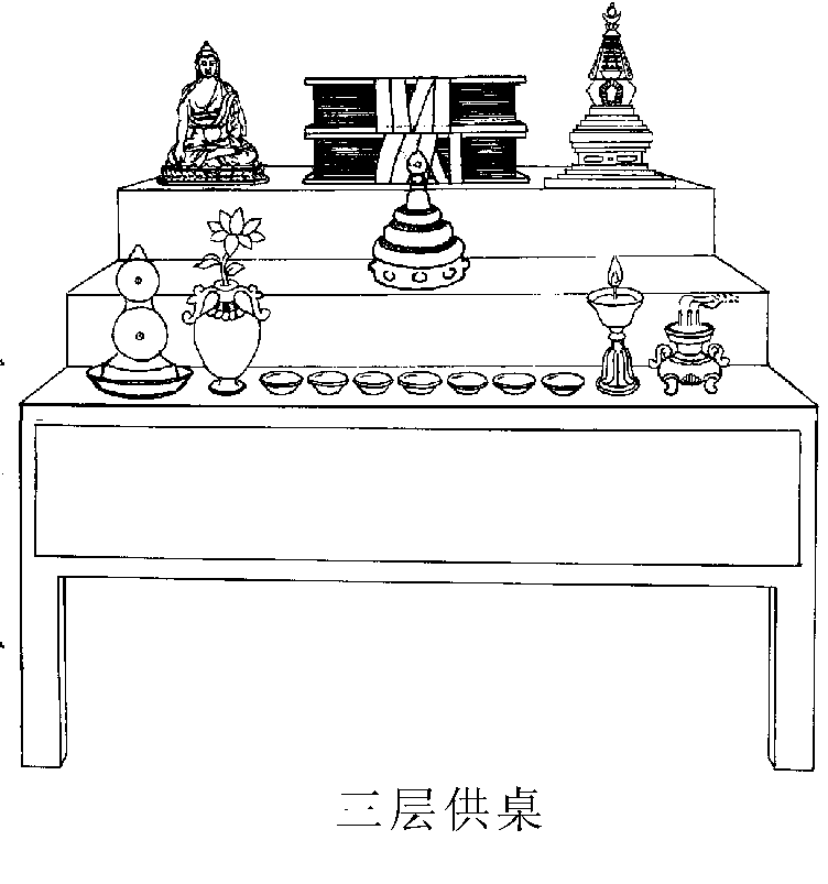 自己陈设的五供等供品为观想的所依处,再观想无数供养天女捧着各种无尽供品,连同歌舞恒时供养十方诸佛及佛子。
