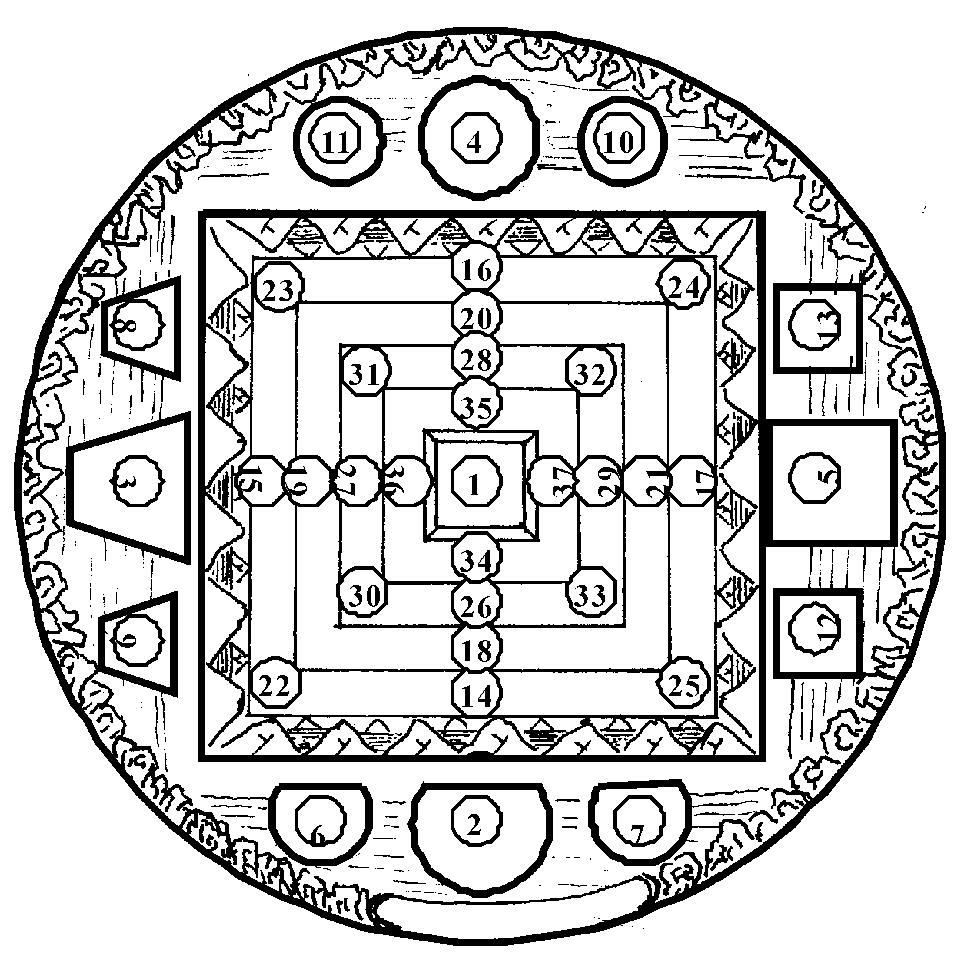 其后再放置东方珍宝山[14]、南方如意树[15]、西方如意牛[16]、北方自然稻[17]。然后将轮王七宝④及宝藏瓶供堆依照从东方顺时针右旋的顺序依次置于四方四隅⑤ ,即东金轮宝[18]、南如意宝[19]、西玉女宝[20]、北大臣宝[21]、东南大象宝[22]、西南绀马宝[23]、西北将军宝[24]、东北宝藏瓶[25]。再将嬉女[26]、鬘女[27]、歌女[28]、舞女[29]外供四天女,花女[30]、香女[31]、灯女[32]、涂香女[33]内供四天女分别置于四方四隅,其顺序仍然是从东方顺时针右旋(同上)。之后的东、西、南、北,依次为日[34]、月[35]、珍宝伞[36]、事业尊胜幢[37]。放置顺序及观想内容,可以参照下面所附的“三十七堆曼荼罗分布图”。下面一边按照顺序观想,一边放置供堆,并一边念诵:
