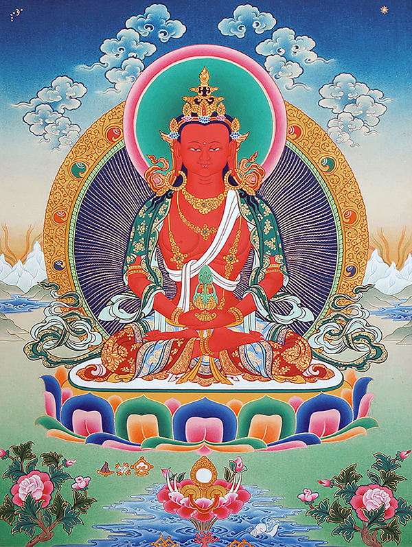长寿佛又名无量寿佛,无量之意为不可计数、广大无边,乃是法身阿弥陀佛以报身佛呈显的另一种形相。身红色,一面二臂,两手结定印。定印之上,有长寿宝瓶。长寿宝瓶中,有长寿甘露。